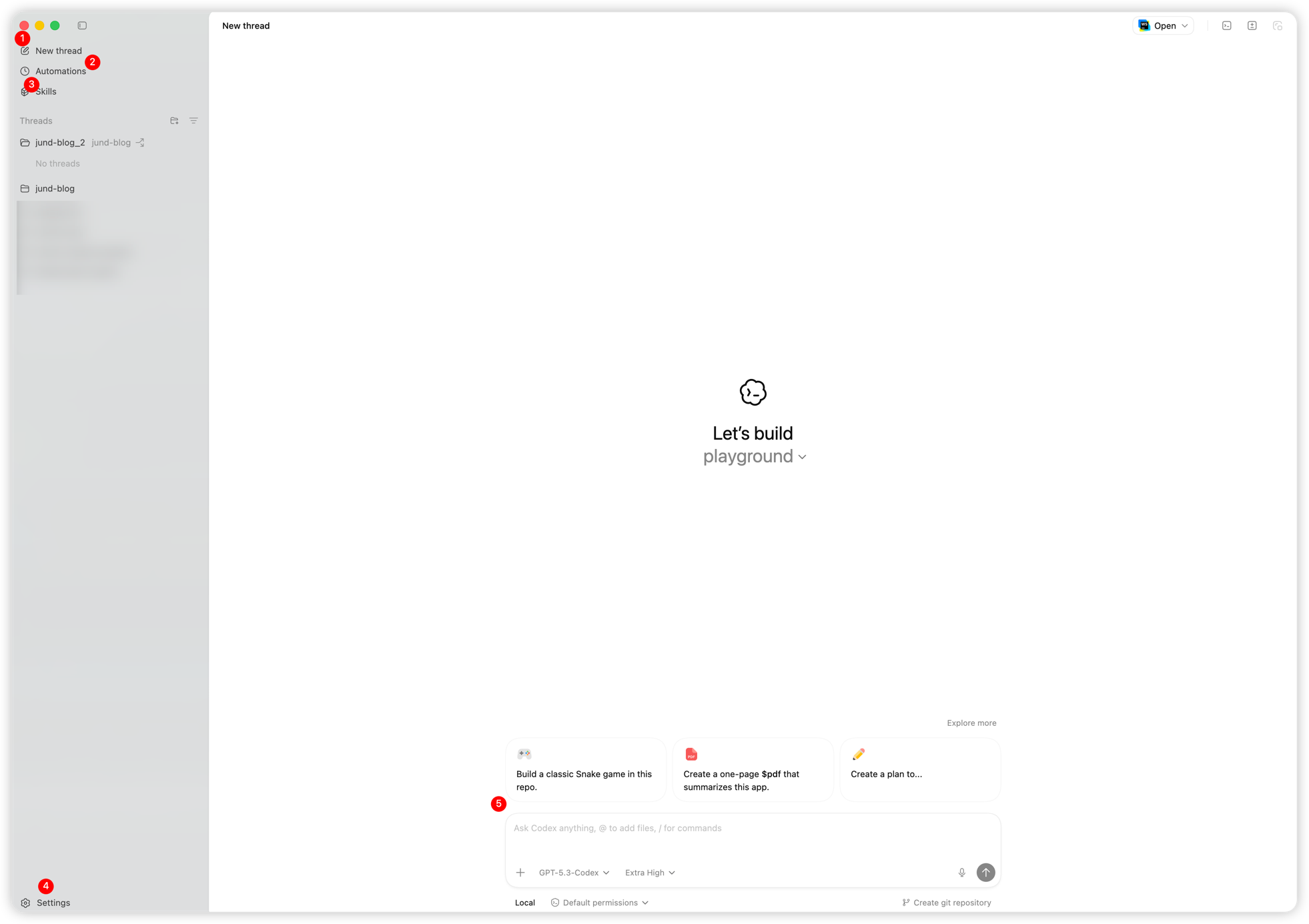 - Settings: codex 앱의 설정을 관리하는 곳입니다. 승인 정책, 샌드박스, MCP 서버, config.toml 등을 설정 및 수정 할 수 있습니다.